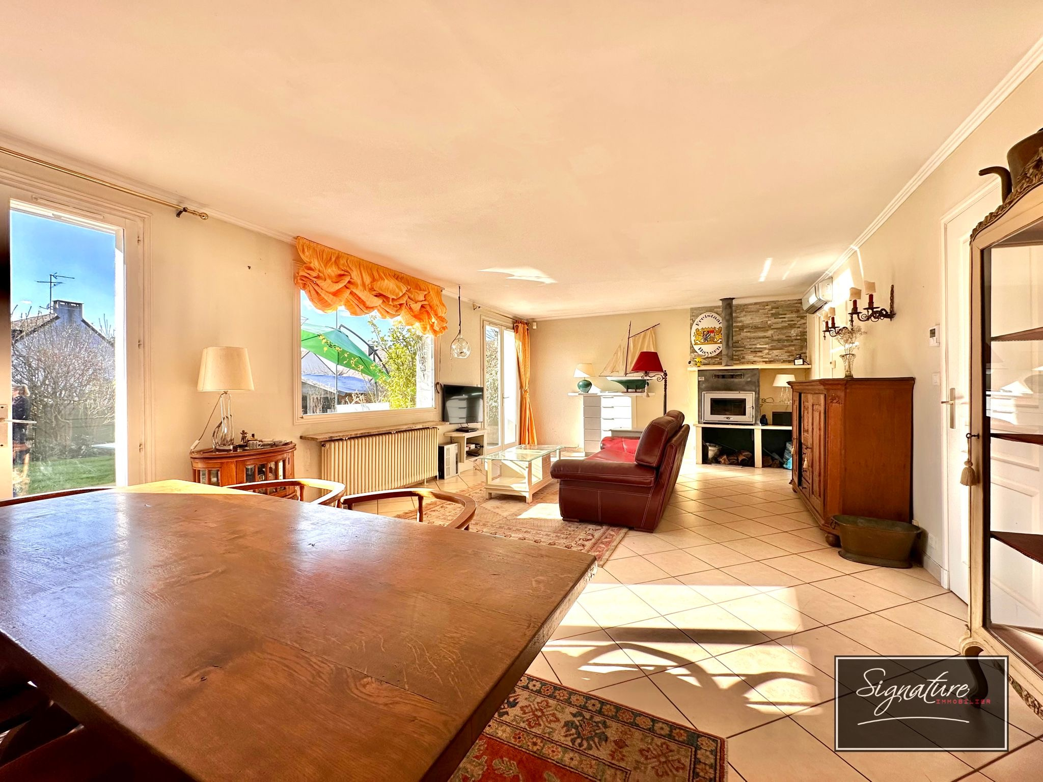 La maison offre au RDC: Une entrée avec placard, accès au sous-sol total, Wc séparé avec lavabo, un beau double séjour-salle à manger ouvert sur le jardin et la terasse avec poéle à bois, une belle cuisine ouverte equipée, une suite parentale avec dressing donnant sur la terrasse et jardin avec sa SDB et une belle mezzanine, un bureau pouvant faire office de petite chambre.À l'étage 2 autres chambres et 1 SDE avec WC.