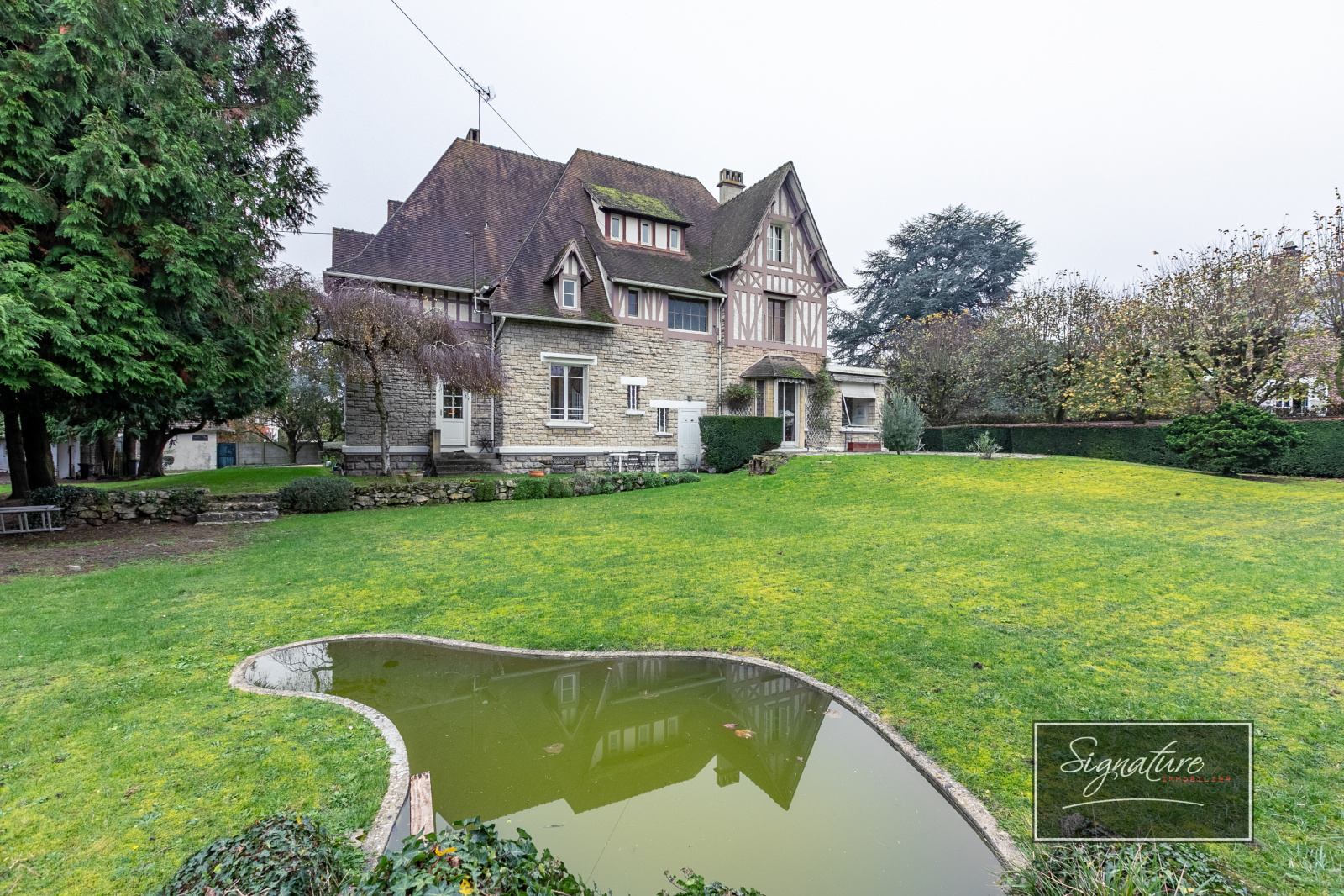 Venez découvrir cette magnifique maison lumineuse de style Anglo-Normand d'environ 330 m², datant de 1925 sur un parc arboré clos de mur de 3100 m² environ dans le quartier du Bois Saint Denis comprenant :