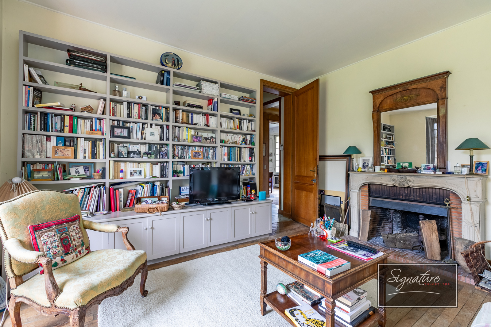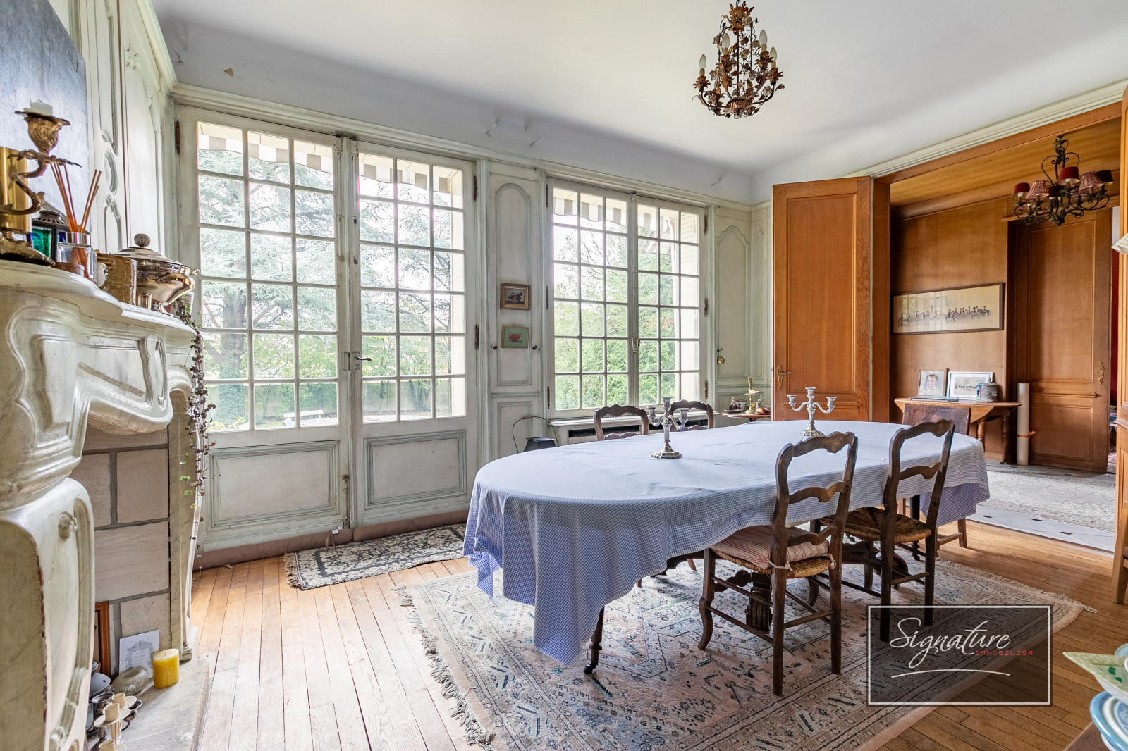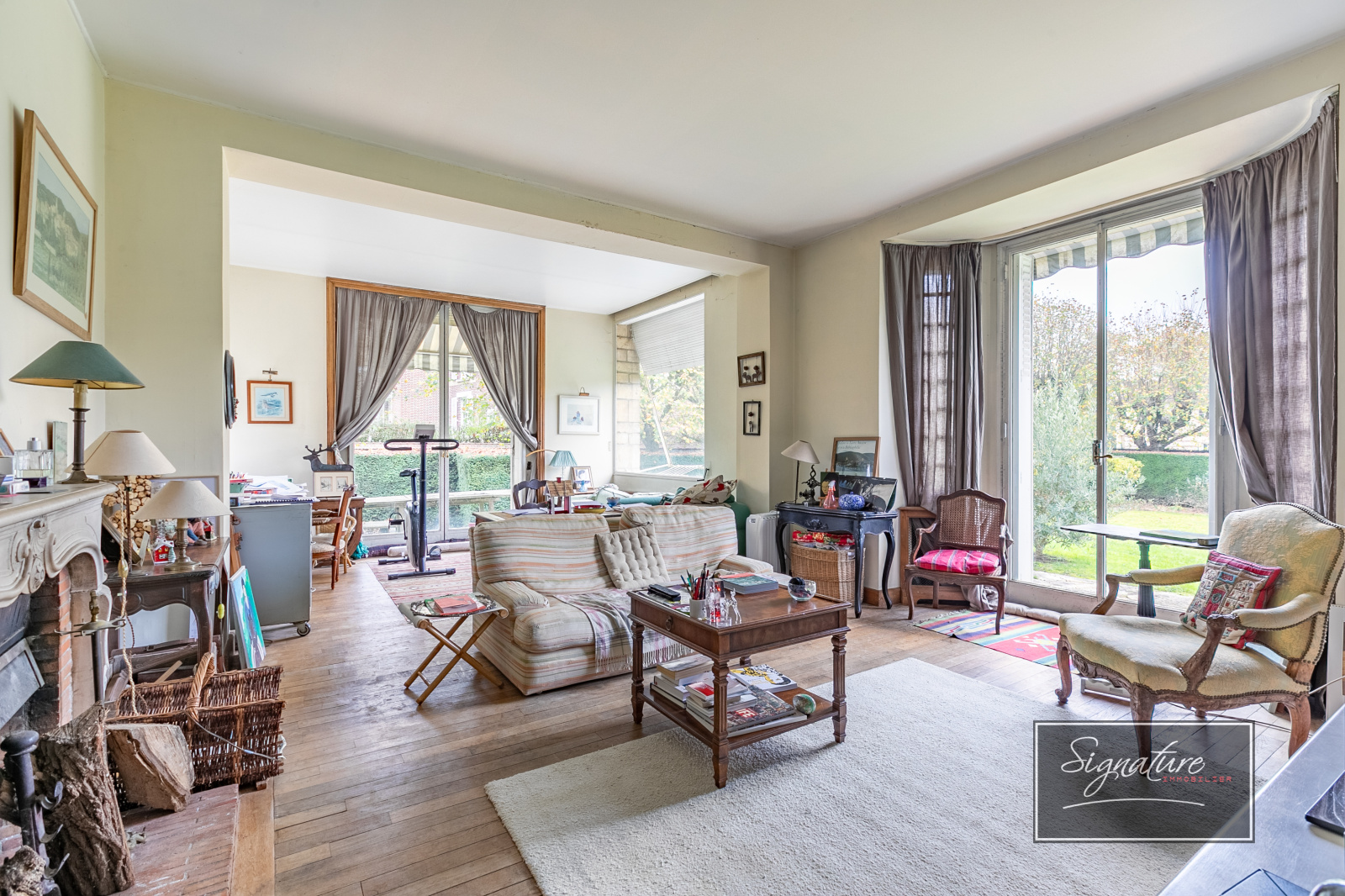 Une grande entrée, une salle à manger avec cheminée donnant sur une terrasse, un double salon avec cheminée et accès à la terrasse exposée Sud, un petit salon avec cheminée, une cuisine dinatoire équipée avec un poêle à bois, une arrière cuisine avec escaliers de service, wc indépendant.