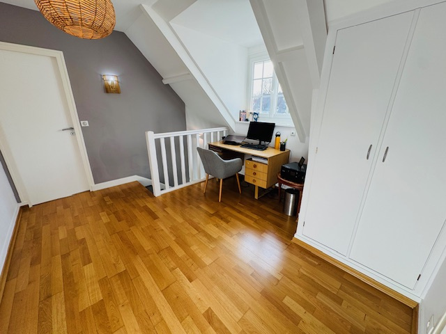 une pièce palière pouvant faire office de bureau ou d’espace détente, trois belles chambres avec rangements intégrés, une salle de bains avec espace de rangement et un WC séparé.